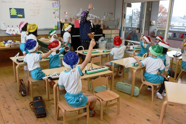 服装について 3歳以上児さんは年間を通じて、半袖・半ズボンで過ごしています。 マーチング・楽器演奏 マーチングや楽器演奏を通して、おともだちと心を一つにします。幼児期に音楽にたくさん触れることは次のようなことが期待されます。